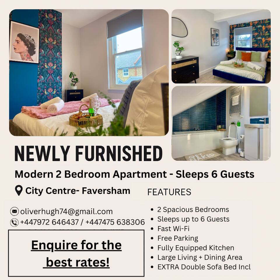 Welcome to your luxury retreat in Kent — a spacious and stylish flat designed with comfort and convenience in mind. Perfect for families, friends, or groups, this property offers plenty of room to relax, recharge, and enjoy time together. Two beautifully presented bedrooms with a total of two beds, comfortably sleeping up to six guests. Whether you’re a family or a group of friends, there’s space for everyone. One modern bathroom, making mornings and evenings hassle-free for larger groups. A fully equipped kitchen with everything you need to cook, dine, and share meals together. A welcoming living area with cozy seating — ideal for unwinding after a day exploring Kent. Free on-site parking for added convenience. The décor is fresh and modern, creating a calm and inviting atmosphere throughout. With flexible sleeping arrangements and generous communal spaces, this retreat is perfect for weekend getaways, family holidays, or longer stays.
